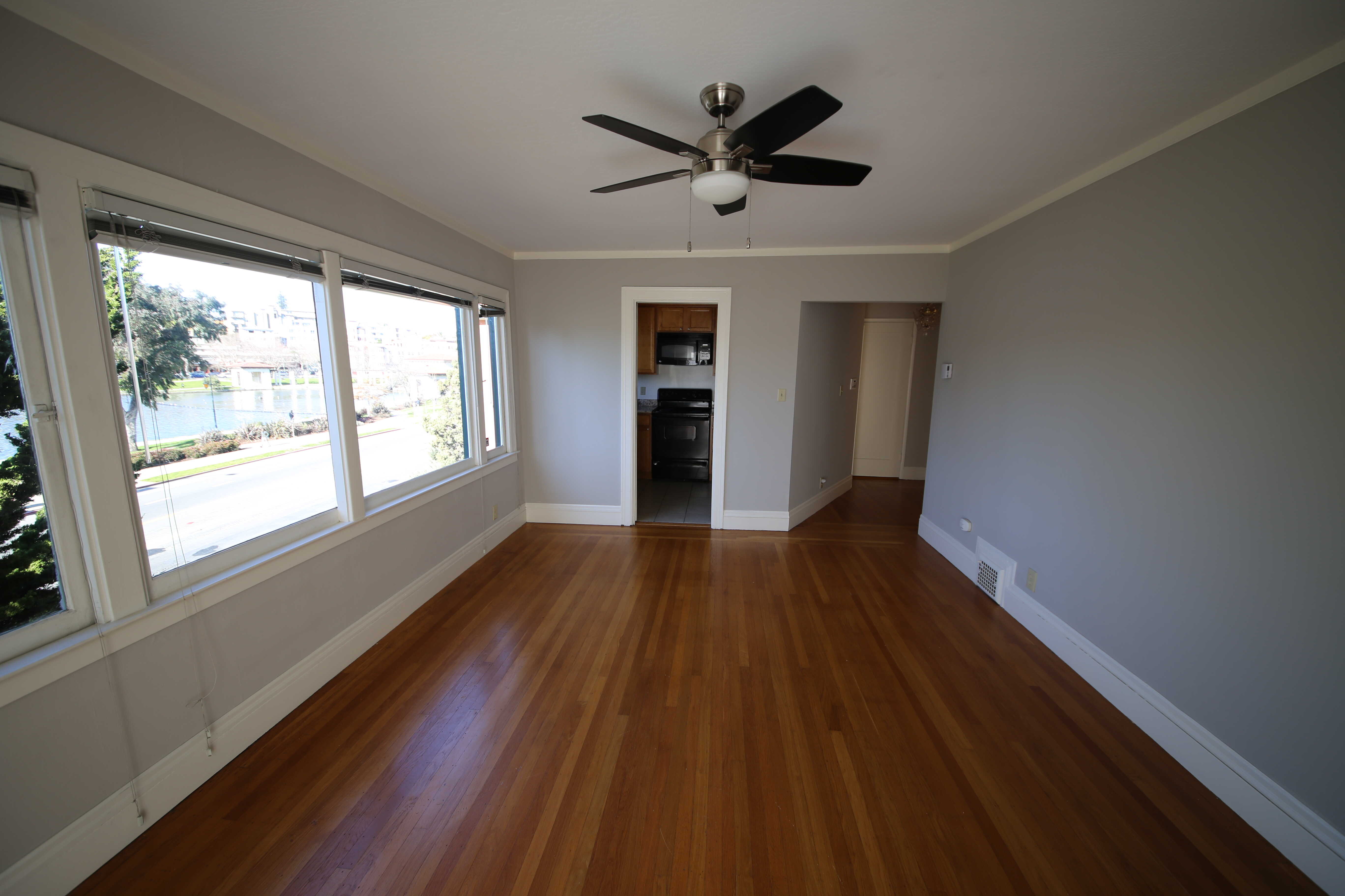 This apartment is on the top floor, has no shared walls, and has a private 380 square foot deck overlooking the lake. Hardwood floors, incredible natural light, electric kitchen, and we're pet friendly! There is a laundry room shared with just two other units, and driveway parking for 1 car is included.